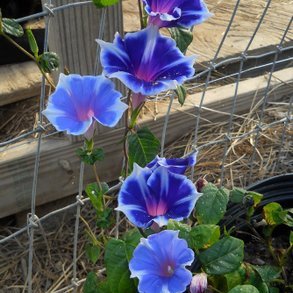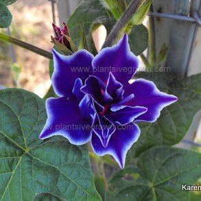 I crossed a youjiro Maisugata with a special purchase double Kikyo from Japan for the F1. I found Kikyo Ice in an F2 grow out I did in 2006. This one is special and comes true from seeds. Like many hybrid Japanese morning glories, this Kikyo Ice may have dramatic shadings as the vine matures so it would be an error to take pictures of the variations and say this is a different variety. Kikyo Ice also occurs in 3 different colors. The dramatic shadings come from the Maisugata parent which I suspect is also related to the Fuji No Monet.
