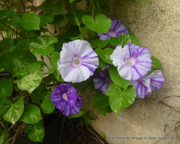 Japanese Morning Glory Large Flower Tie Dye is a long vine with heart shaped leaves. The seeds I planted this year were (correction) 9 years old kept in a paper envelope in a desk drawer! One out of a handful survived.